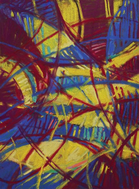 I wonder about drips and add water along one edge. But I discover that drips don’t happen that easily in pastels. (You can see there’s a bit of darkness along the right hand side. That’s wet pastels.) I feel that how I’ve been working, hatching the pastel, has begun to look too much the same. Pretty, I think, and I don’t want pretty. I also feel the big swooping shape takes you right out of the picture. So I decide to introduce long lines across the whole picture plane to stop that movement as well as to add some discomfort to the prettiness. Will it work?
