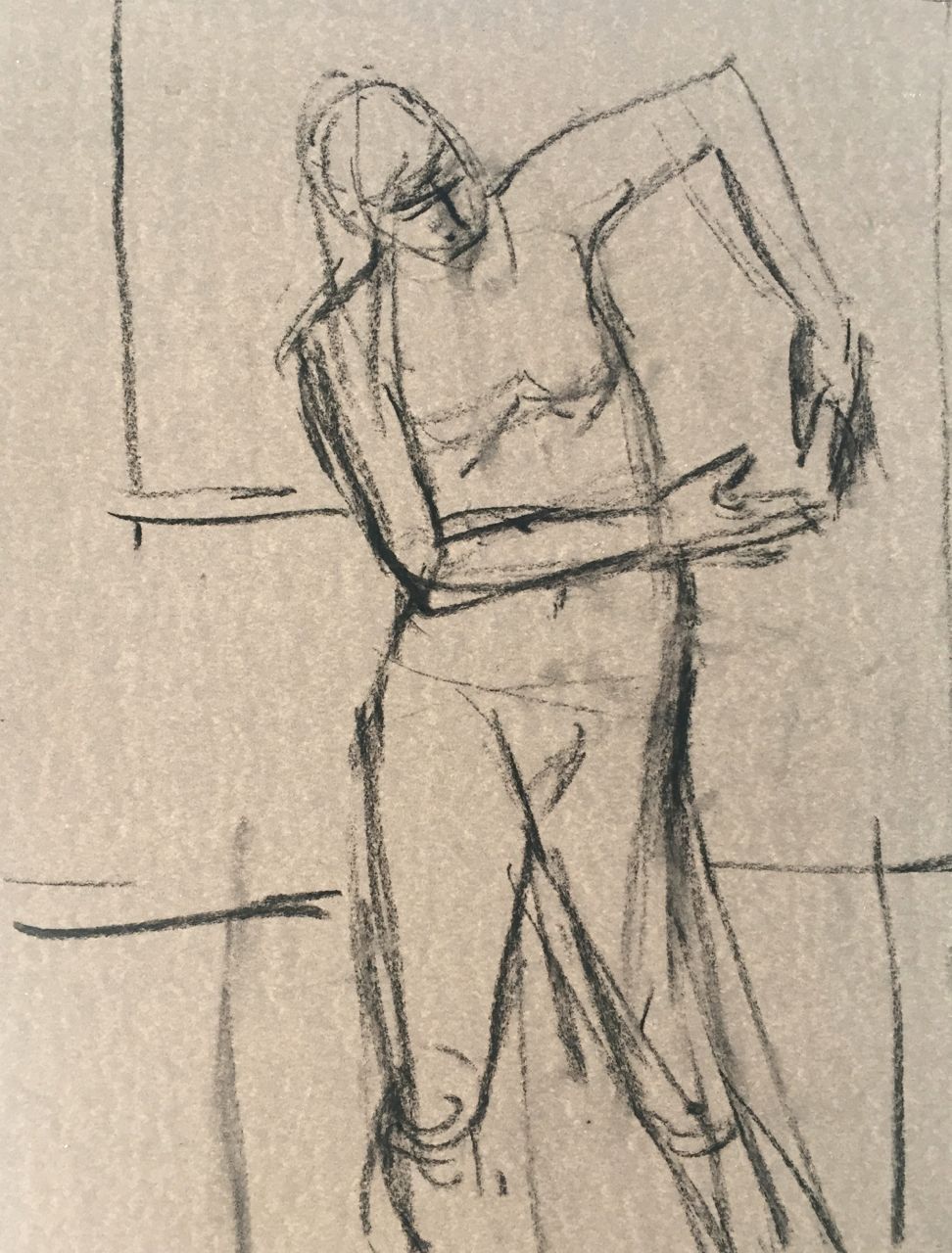 Alright. I have my start. Next I needed to draw up my idea in vine charcoal onto one of the 9 x 12 inch Wallis sheets (Belgian Mist) I’d brought down with me: