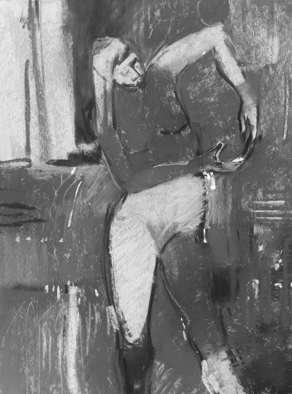 Next I feel the need to redefine the figure with charcoal. I want the charcoal to be a part of the painting, not only an underlying medium. (I really like using and effects of charcoal!) I also add some pink and light warm gray Holbein marks. (I usually don’t use Holbein pastels but for some reason, I brought these two colours along with me.)