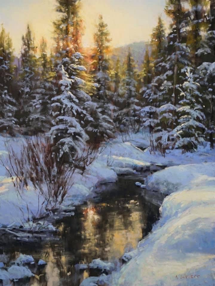 Okay, this is a wee bit different from what I expected to be publishing. Aaron Schuerr, our guest this month, is renowned for his plein air work. In fact, he just won the Best Pastel award at the recent Plein Air Convention in Santa Fe! And what he’s really known for is extreme plein air meaning he paints in all seasons – rain, snow, or shine – and he also goes deep into the landscape to paint.