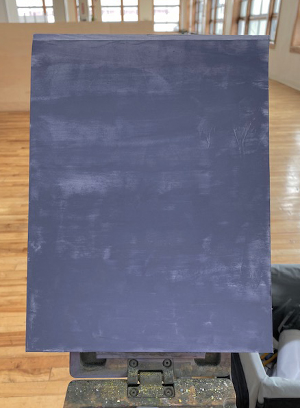 After putting some strokes of purple grey pastel on the white, sanded paper, I proceeded to dip a brush in isopropyl alcohol and melt the pastel into a somewhat uniform tone.