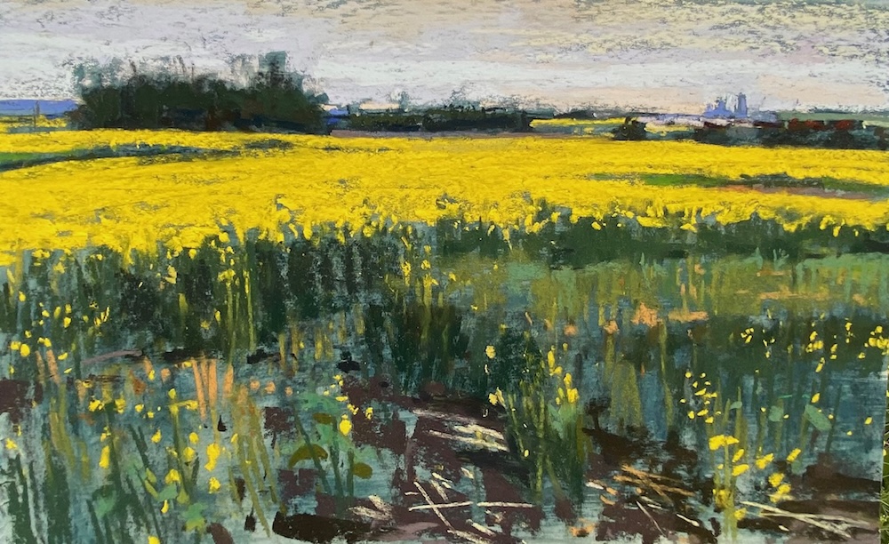 Painting en plein air in mid-summer in the prairies. There’s no shortage of canary yellow fields of canola to inspire.