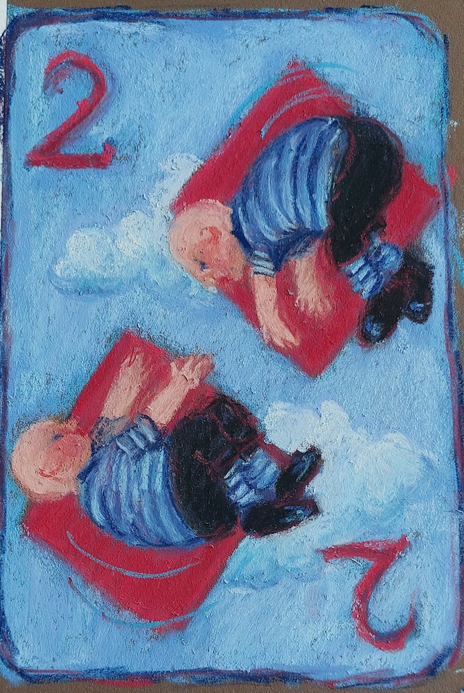 Nicolette van Dam, 2 Two of Diamonds, 30 October 2023, Schmincke pastels on Canson Mi-Teintes Touch, 8 x 5 in. Tweedledee and Tweedledum, two inseparable twin brothers, effortlessly floating high in the sky.