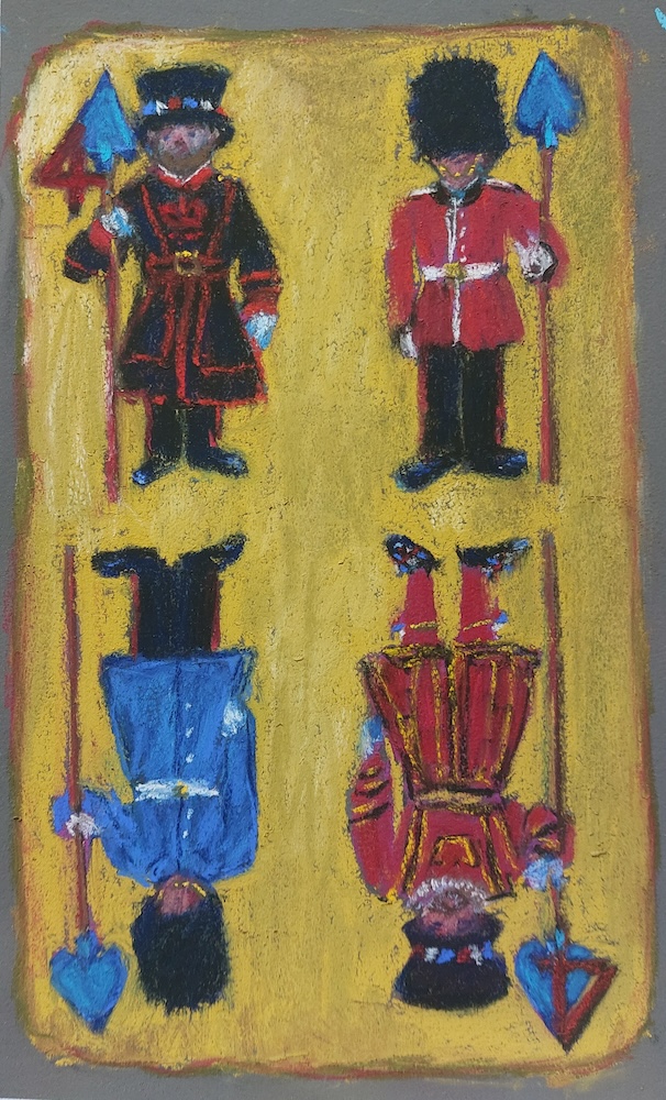 Nicolette van Dam, 4 Four of Spades, 28 October 2023, Schmincke pastels on Canson Mi-Teintes Touch, 10 x 6 in. Spades might be based on the Medieval halberd, a terrible weapon. These four guards didn’t frighten me so much, even though I had to paint the two bottom ones upside down, as it was too much hassle to keep flipping the paper. But after 27 days of practice, that’s a piece of Eat Me cake.