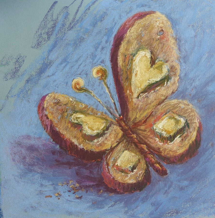 Nicolette van Dam, B. Bread-and-Butterfly, 2 October 2023, Schmincke pastels on Canson Mi-Teintes Touch, 11 x 11 in. Alice was astonished when she saw this insect, consisting of bread and butter, but could it flutter?