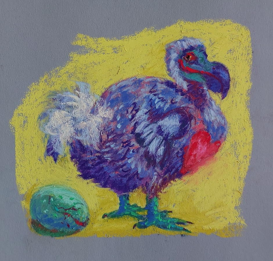 Nicolette van Dam, D. Dodo, 4 October 2023, Schmincke pastels on Canson Mi-Teintes Touch, 7 x 7 in. The Dodo was one of the birds that swam in Alice’s pool of tears. It actually represents the author, Lewis Carroll, whose real surname was Dodgson, and as he had a stutter…