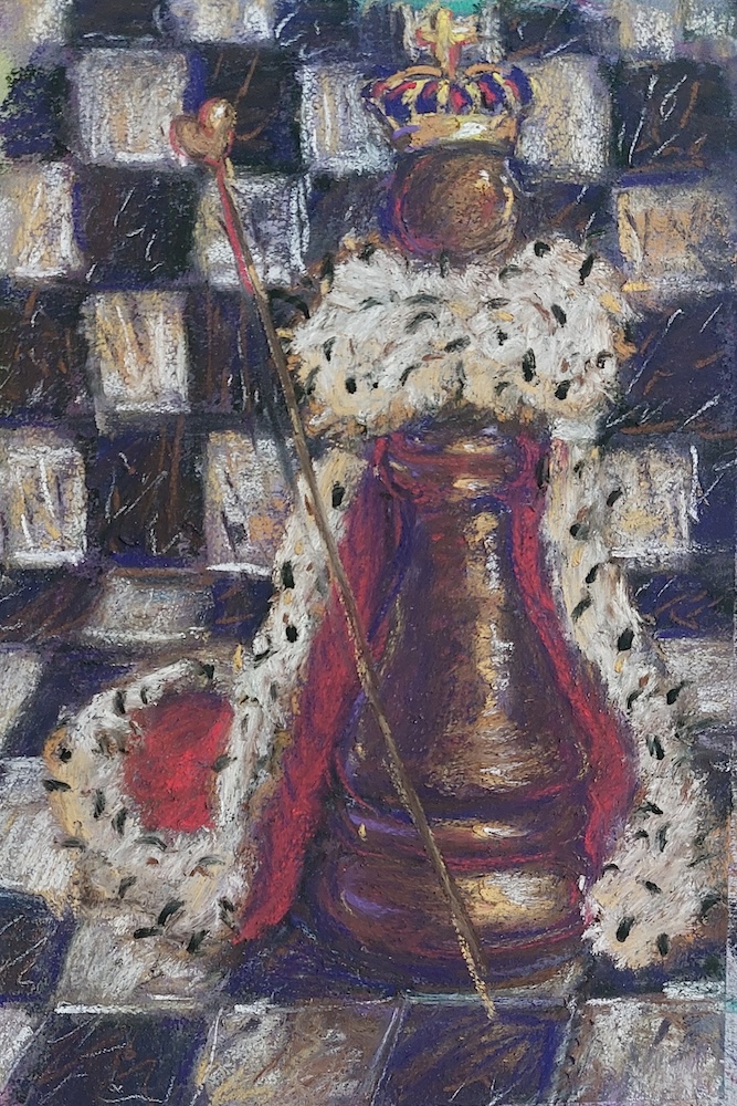 Nicolette van Dam, K. King, 11 October 2023, Schmincke pastels on Canson Mi-Teintes Touch, 8 x 5 ½ in. The Wonderland countryside was laid out like a huge chessboard and of course there was a King.