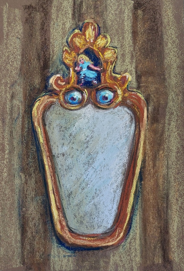 Nicolette van Dam, L. Looking Glass, 12 October 2023, Schmincke pastels on Canson Mi-Teintes Touch, 9 x 6 1/4 in. In her drawing room at home, there was a Looking Glass. Alice miraculously went through it and found herself in a reversed fantasy world.
