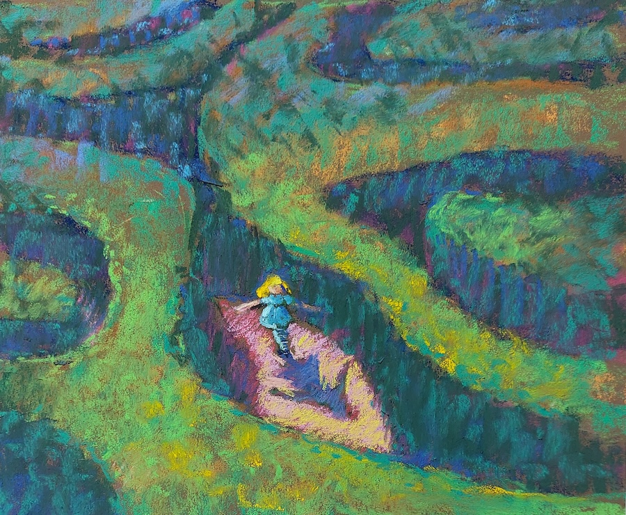 Nicolette van Dam, M. Maze, 13 October 2023, Schmincke pastels on Canson Mi-Teintes Touch, 9 x 7 3/4 in. When searching for a way out of Wonderland, Alice comes into a maze and has now even less hope of ever returning home.