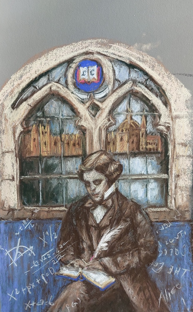 Nicolette van Dam, N. Novelist, 14 October 2023, Schmincke pastels on Canson Mi-Teintes Touch, 11 x 8 9/16 in. A homage to the awesome, multi-talented Lewis Carroll, novelist, poet, mathematics don at Oxford University, a dean of the Anglican Church. This is him at age 24. His Alice stories were a great commercial success right from the start and Alice is still an important part of popular culture.