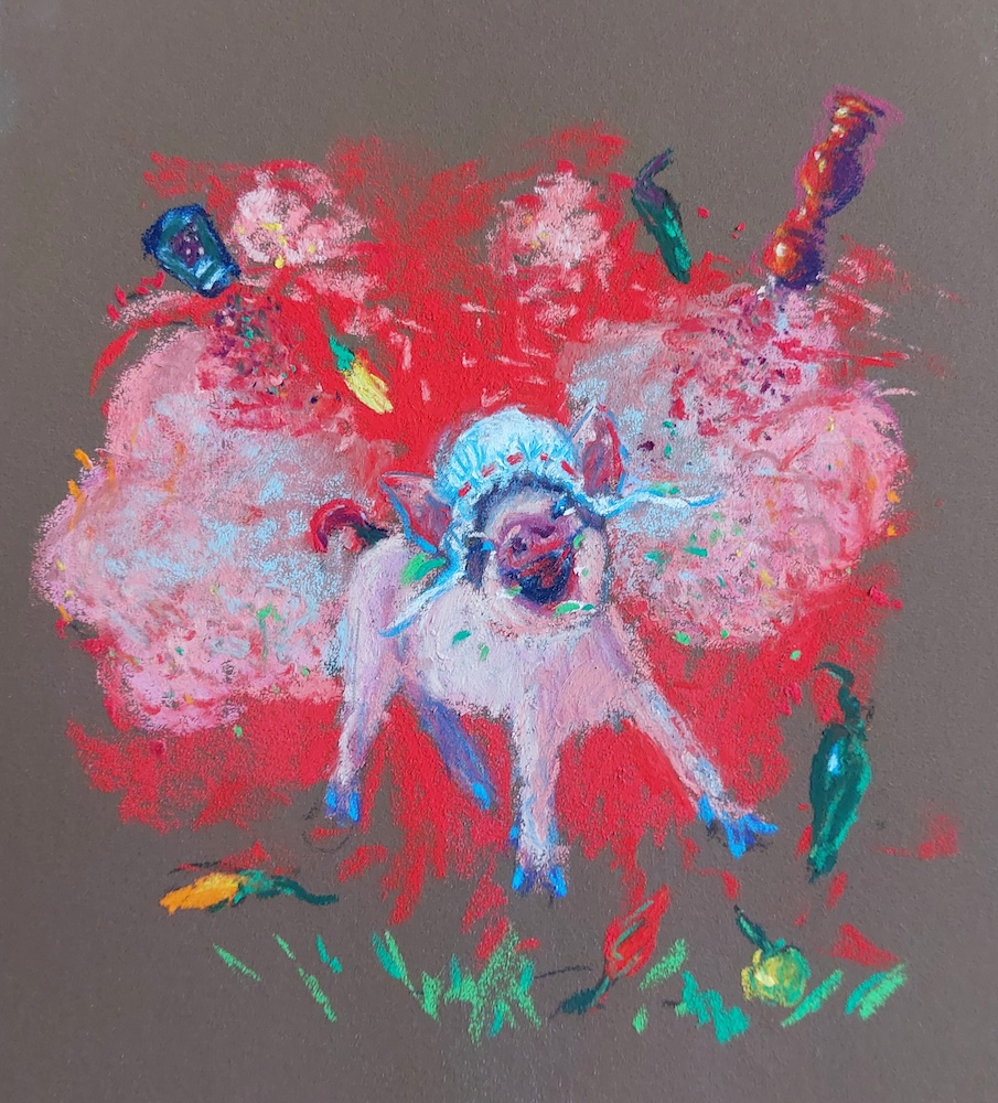 Nicolette van Dam, P. Pig and Pepper, 16 October 2023, Schmincke pastels on Canson Mi-Teintes Touch, 7 ⅜ x 7 ⅜ in. In the Duchess’s kitchen, the cook was shaking clouds of pepper into a large cauldron of soup. The Duchess was cradling a sneezing pink baby in her arms, which a few moments later appeared to be a piglet. Alice set it free in the woods.