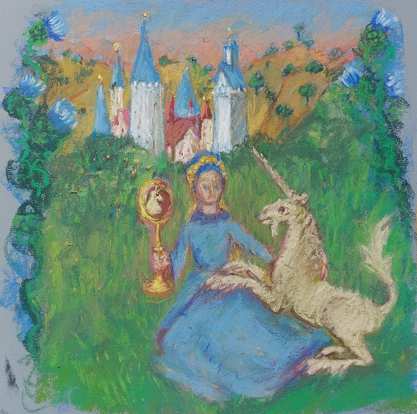 Nicolette van Dam, U. Unicorn, 21 October 2023, Schmincke pastels on Canson Mi-Teintes Touch, 9 ¾ x 8 ⅝ in. In the woods, Alice came across a battle between a Lion and a Unicorn. The Lion stands for England and the Unicorn for Scotland, which have also fought each other. The Unicorn is believed to be so pure and chaste that only a maiden could tame it.