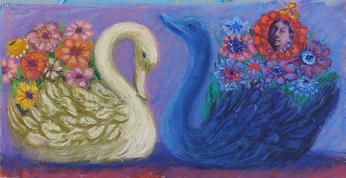 Nicolette van Dam, X. Xuthus, 24 October 2023, Schmincke pastels on Canson Mi-Teintes Touch, 4 ¾ x 13 in. A Xuthus is a Swallowtail butterfly that was no doubt fluttering around the Queen’s flowers. She is courted by a Swift, handsome Swallow. Will they produce little baby fork tails?