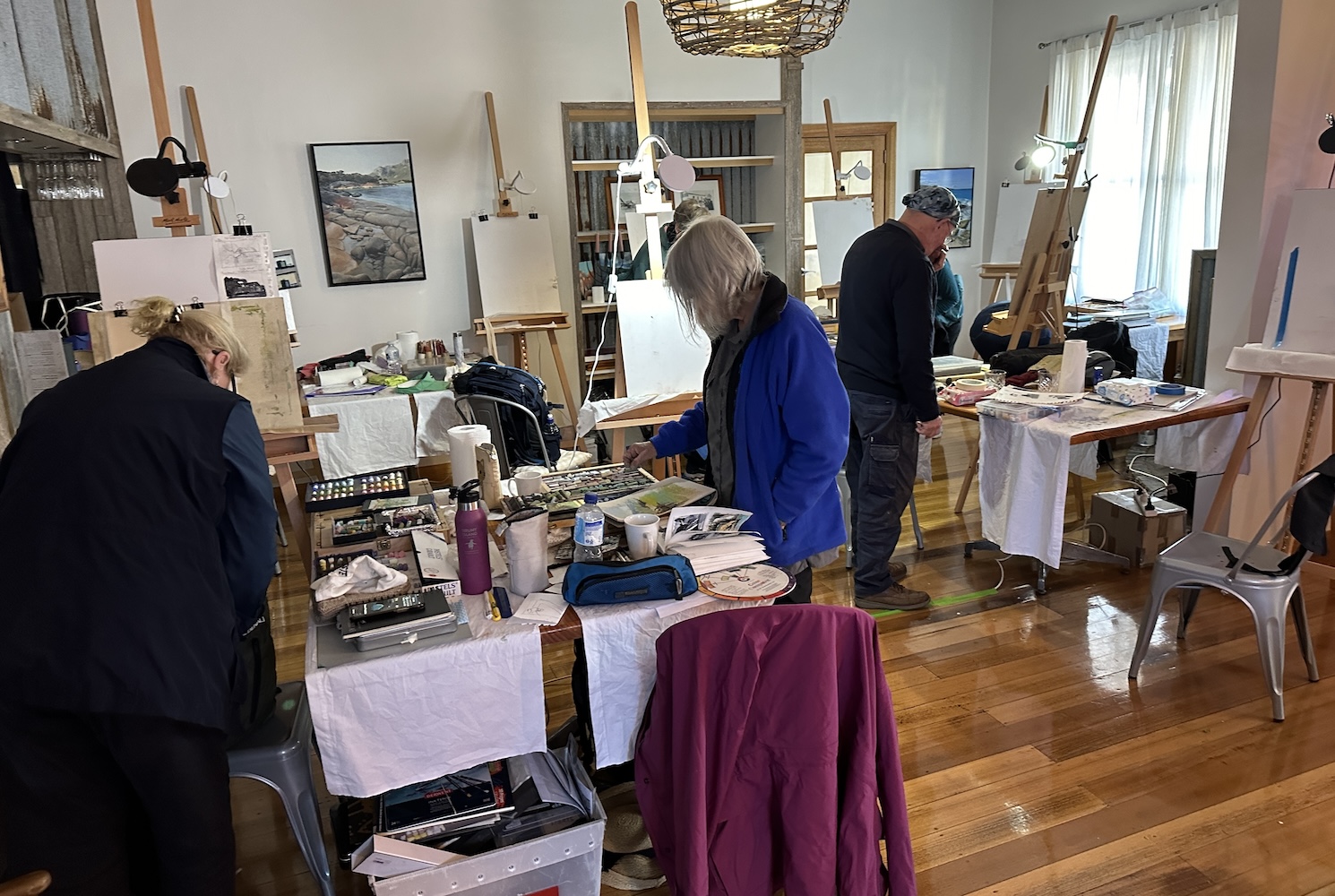 These feelings of inspiration are true of all the work done by students in my workshops. I taught three 5-day workshops before my Tasmania art retreat – one in New Zealand’s North Island, one in Gold Coast, Australia, and one in Melbourne, Australia – and all filled me with pleasure and inspiration. However, spending 10 days and evenings with these students in Tasmania gave a whole other opportunity to dig into the possibilities of art-making. Students also took advantage of the opportunity to continue working on their art beyond the hours of the class. These are the particular joys of a painting holiday (destination) workshop!