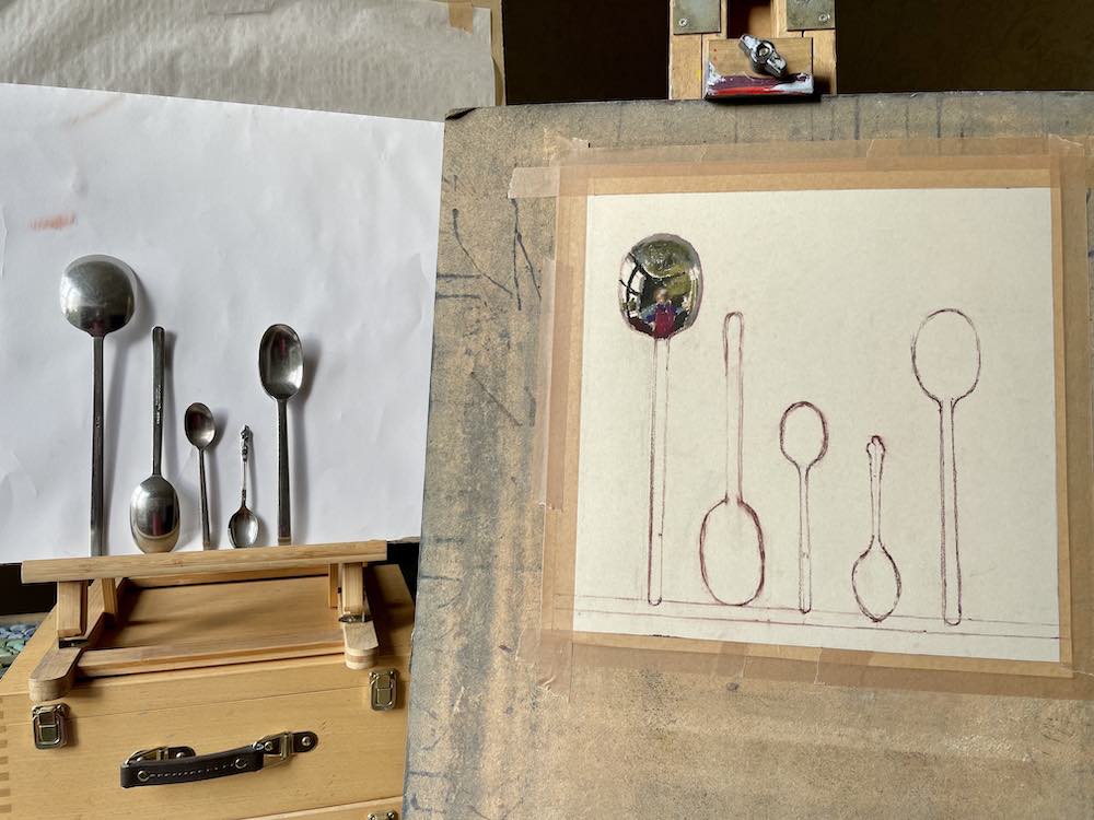 My daughter had been busy drawing typewriters at the kitchen table for her A-Level Art homework. It reminded me of my own experience of drawing household objects. I noticed my reflection in a ladle as I cooked tea and that was it. It made me smile and thought it would be an interesting exercise. I drew it from life, quickly. Moving on, I added a large serving fork and vegetable serving spoon, (which was a bit of a challenge because it had lots of holes in it). This was Ladle Selfie II.