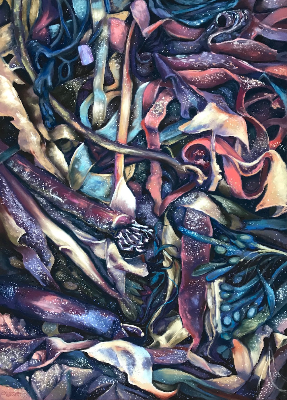 I started painting seaweed a few years ago after taking photos and sketching along the rocky beaches of Northumberland and Scotland. Winter storms had washed up masses of it – strewn along the shore in ribbons and twists of deepening colour. I am interested in presenting subjects that may be overlooked or unrecognised and I think this is probably why I got so engrossed in examining the seaweed that day.