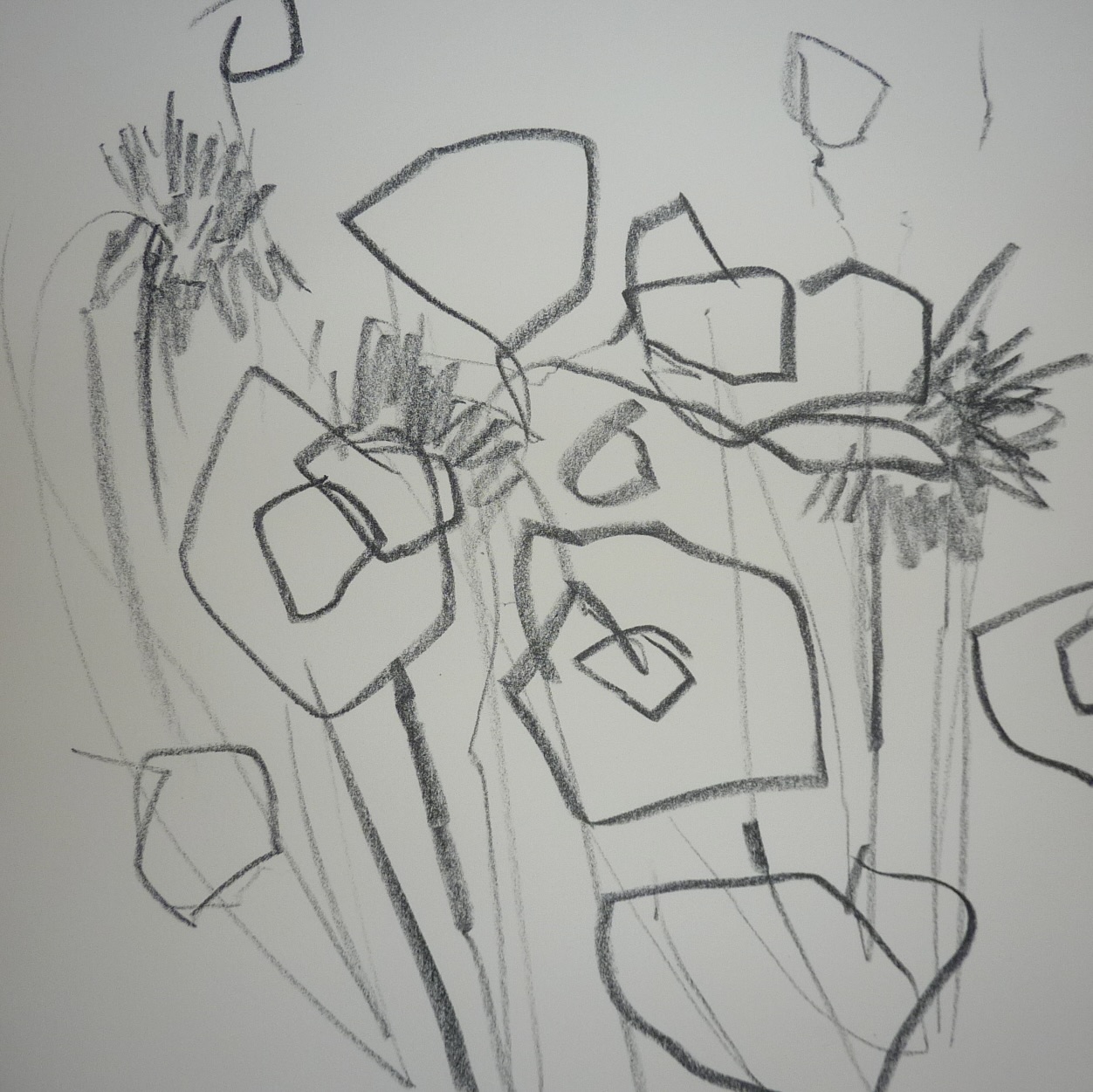 - I start with a piece of 12×12 in piece of LuxArchival. (I need a paper or board that will take abuse.) I used black charcoal to draw some flower shapes. I am thinking about variation and movement.