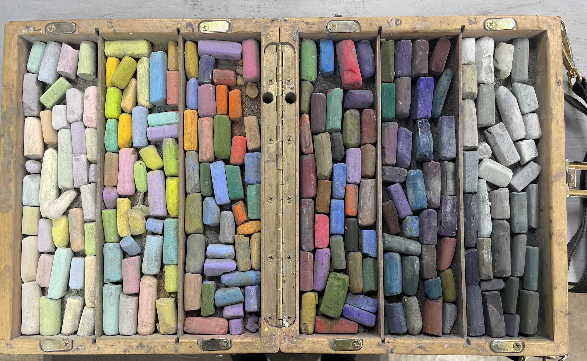 I sort my pastels by value, very light, light, medium, dark and very dark, I learned this from Susan Kuznitsky. This helps me since I paint by value not color. I used to keep them in Tupperware bins but recently I built my own value box with the 5 values. Each bin measures 18×28 in and is filled with cornmeal to keep them separated. Cornmeal also cleans the pastels. I purchased a 50lb bag through Amazon.